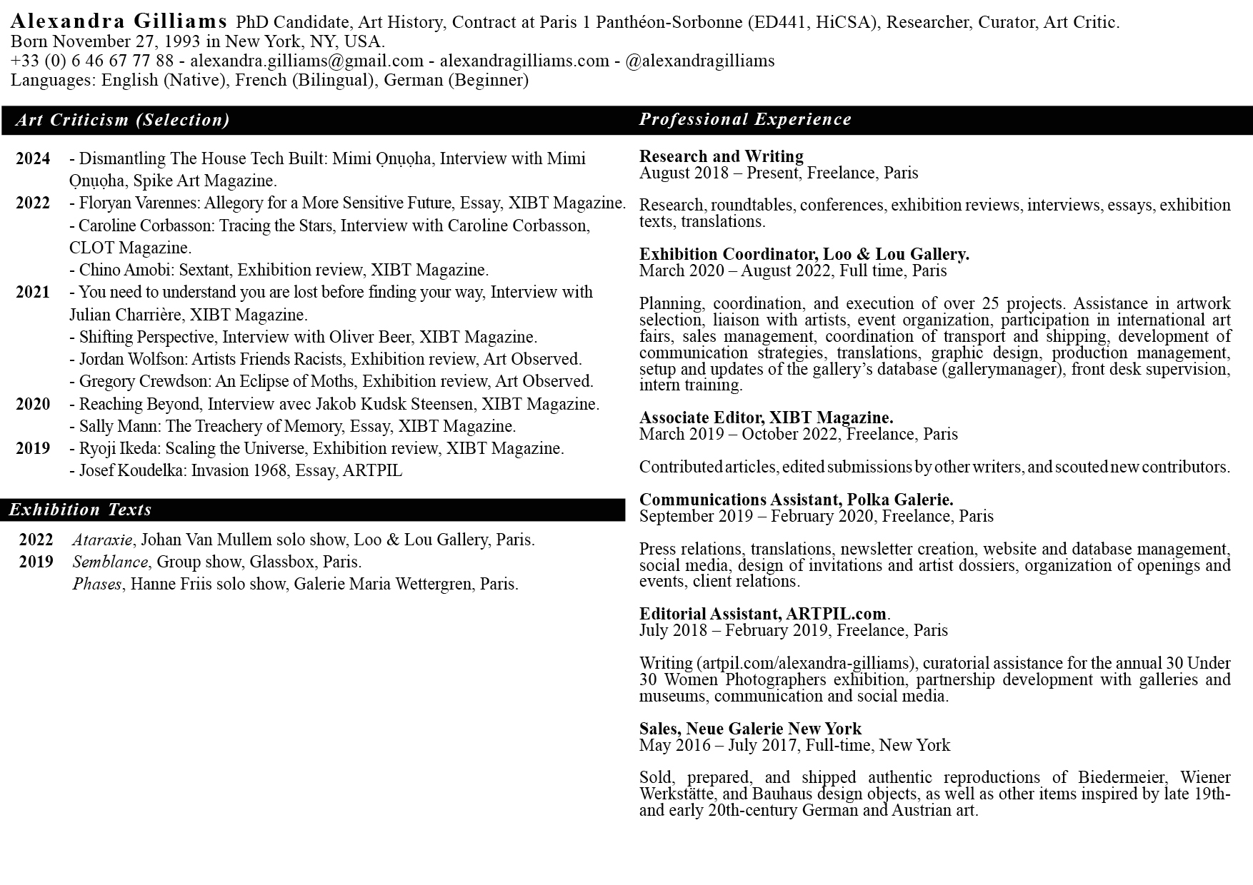 Alexandra Gilliams is a PhD candidate in Art History at Université Paris 1 Panthéon-Sorbonne. She is also a writer and researcher who has assisted in developing cultural projects for galleries, museums, and publications for eight years.